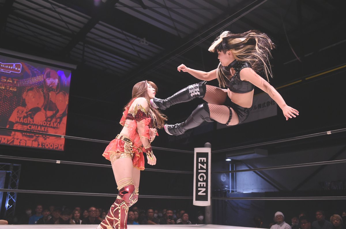 今年1・3大田区ではダークネス・レボリューション同門でのタッグタイトルマッチ、ツインスター王座に挑戦。キャリア豊富な野崎渚とのコンビで松井珠紗&CHIAKI組に挑んだ。