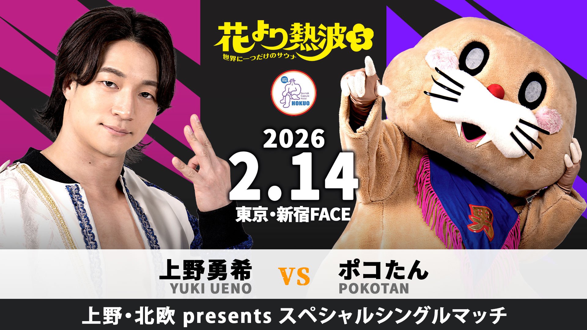 また、「上野・北欧 presents スペシャルシングルマッチ」として上野勇希がDDTのゆるキャラ、ポコたんと激突する。 予測不能なポコたんの動きに、実力者・上野がどう対応するのか。カオス必至の異次元マッチが期待される。