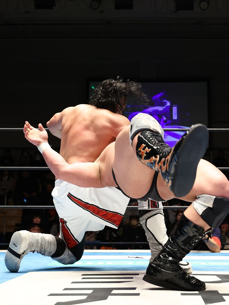 終盤は互いの必殺技を巡るスリリングな展開となった。後藤の牛殺しに対し、大岩はラリアットで応戦。