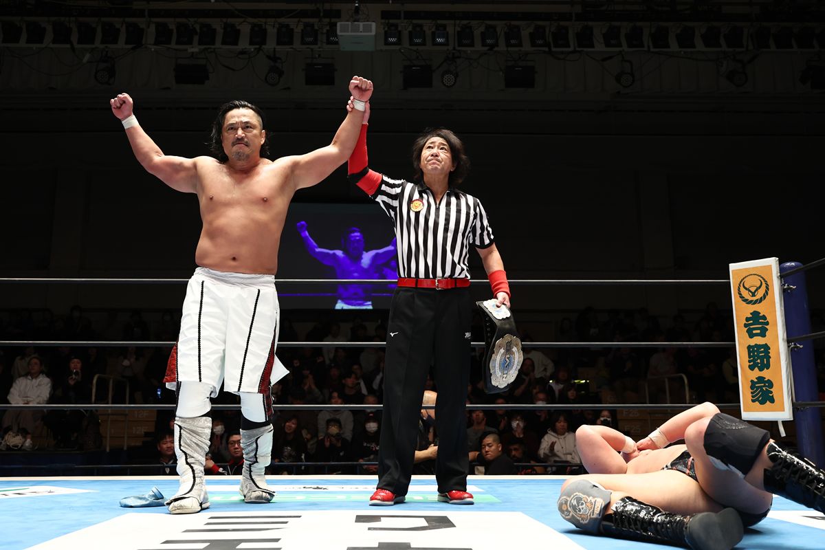 大岩の反撃をカウンターのヘッドバットで断ち切ると、最後は新必殺技「後藤革命」を炸裂させ、3カウントを奪取した。