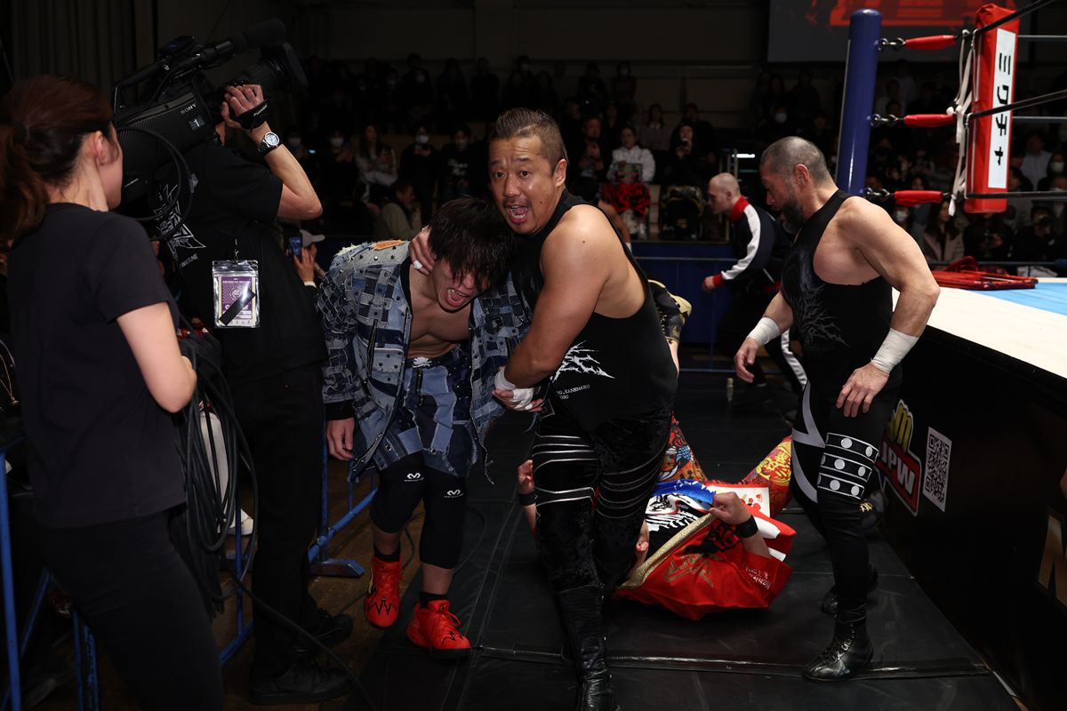 リング上でも金丸と東郷が矢野を金具むき出しのコーナーへハンマースルーするなど、悪の連係で主導権を握った。