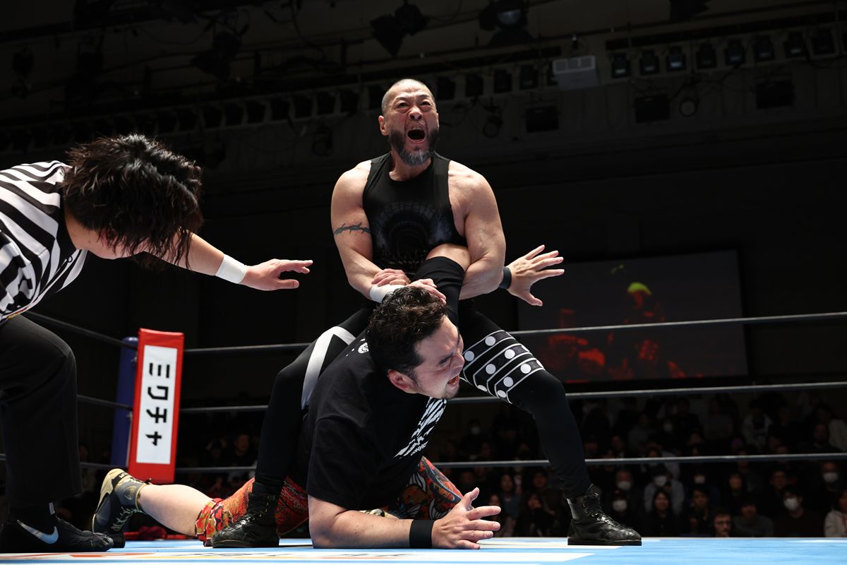 しかし、ウルフも強靭な肉体と柔道殺法で対抗。成田や東郷を豪快な一本背負いで投げ捨て、串刺しラリアットからブレーンバスターで成田を追い詰める場面も見られた。