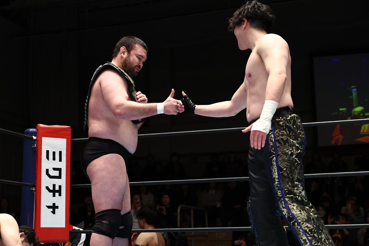 しかし、ウルフも強靭な肉体と柔道殺法で対抗。成田や東郷を豪快な一本背負いで投げ捨て、串刺しラリアットからブレーンバスターで成田を追い詰める場面も見られた。