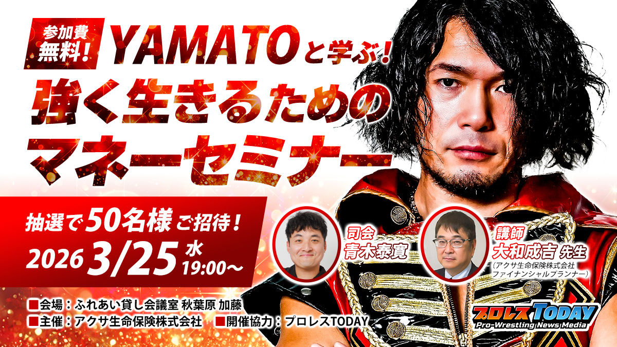 妥協なき肉体と技術でファンを魅了し続けるトップレスラー・YAMATO選手(ドラゴンゲート)をゲストに迎え、アクサ生命主催、プロレスTODAY企画の「YAMATOと学ぶ、強く生きるためのマネーセミナー」を3月25日(水)に開催!抽選で50名様をご招待いたします!!