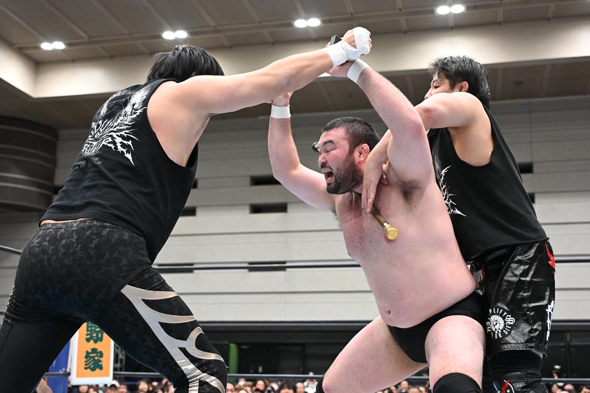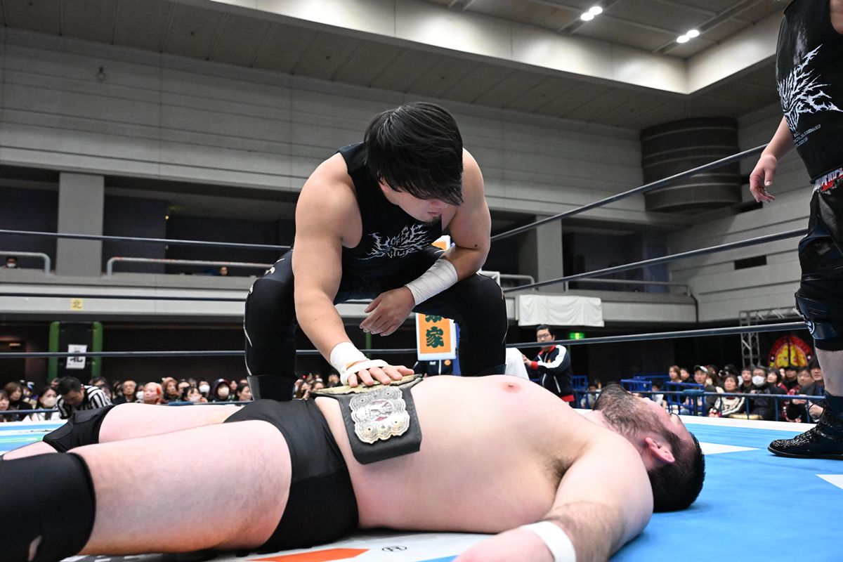 リング上で孤立したYOHに対し、東郷がスポイラーズチョーカーで絞め上げると、最後は成田がコーナー最上段からの「地獄の断頭台」を敢行。ウルフの目の前でパートナーを無惨にKOし、3カウントを強奪した。