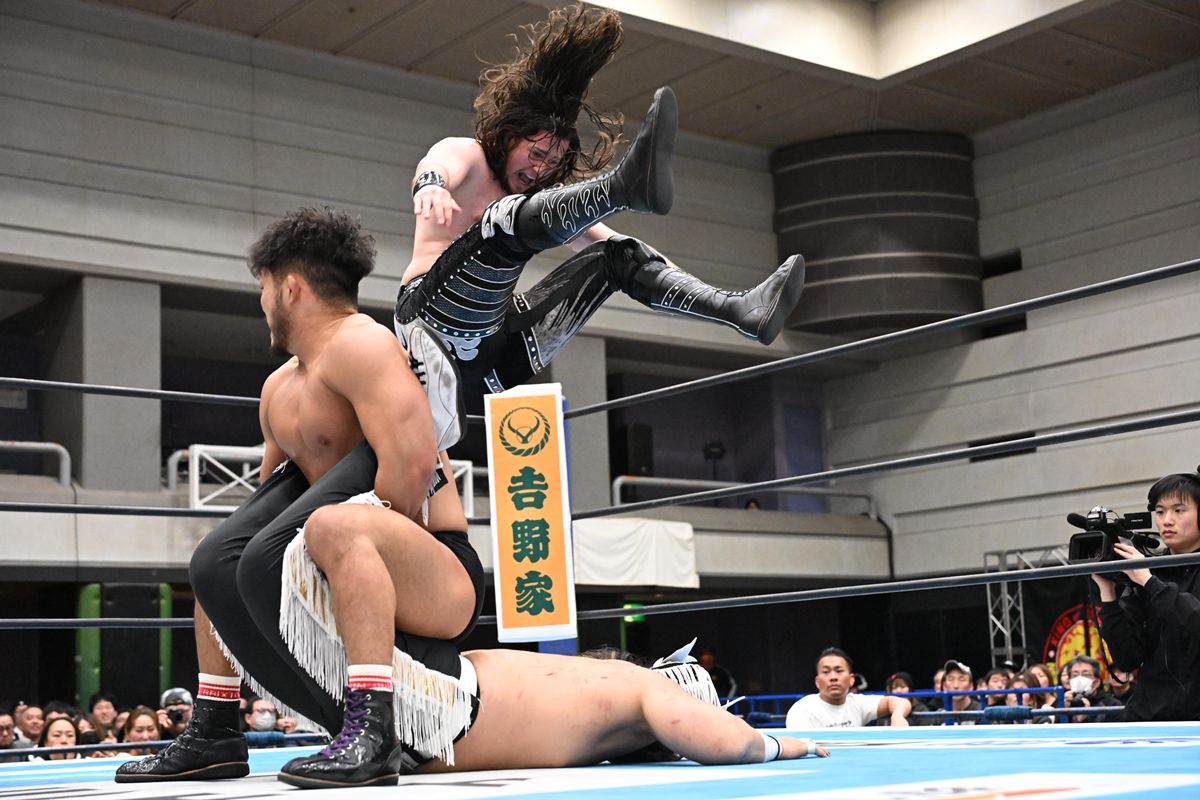 試合序盤、海野と上村は好連携を見せ、ダブルのドロップキックなどで王者組を圧倒した。