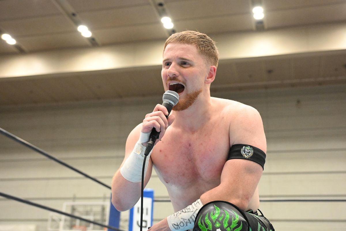 2.11大阪でスペシャルシングルマッチを戦うデビッド・フィンレーとカラム・ニューマンが激しくやり合う中、リング上では辻とジェイクが対峙。
