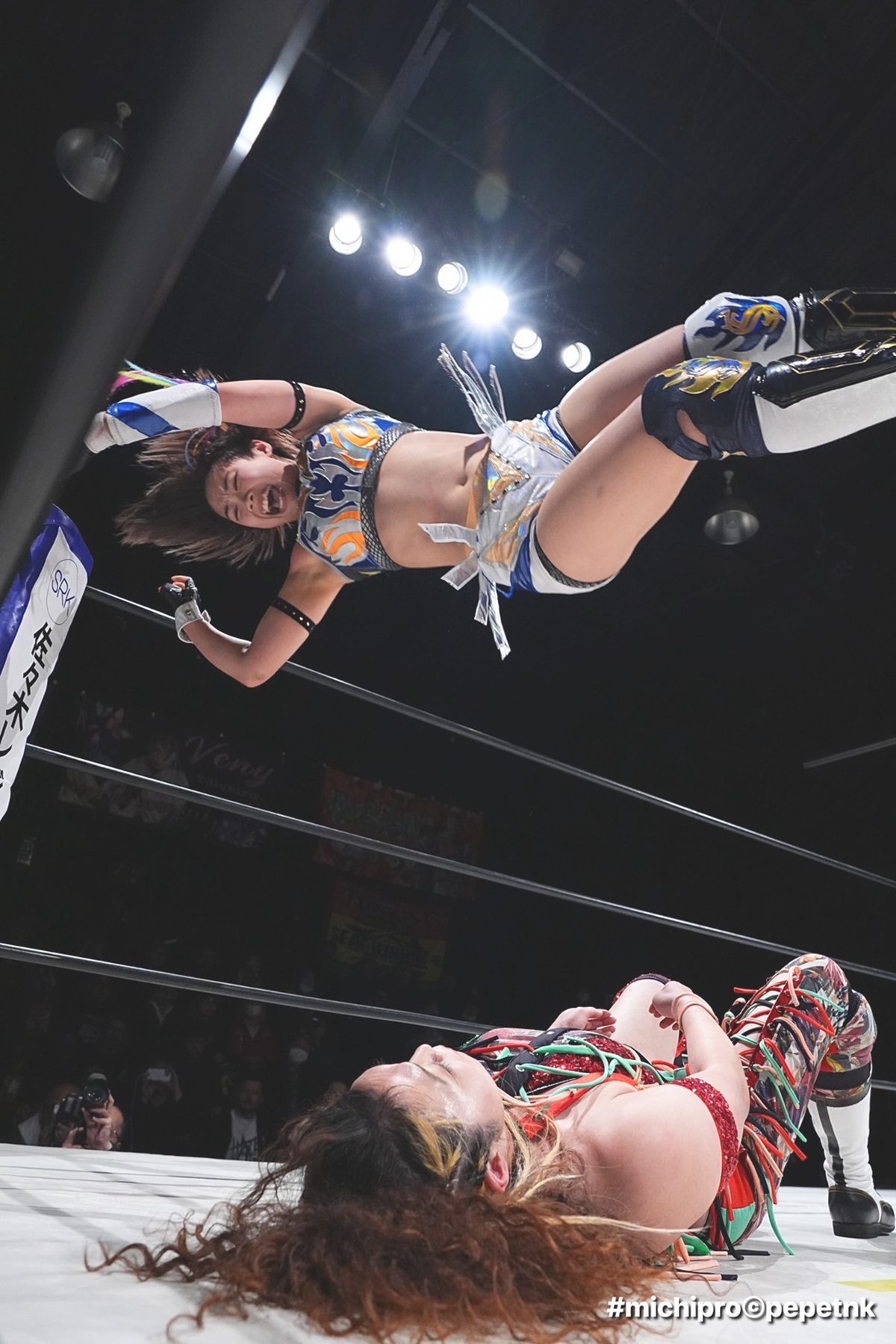 松本が女子プロ冬の時代を乗り越えてきたフリーの大物で、MIRAIも6年以上のキャリアを積み重ねてきた。それだけに、試合は事実上の初遭遇ながらチャレンジマッチには終わらせない、激しくもエモーショナルな闘いになった。