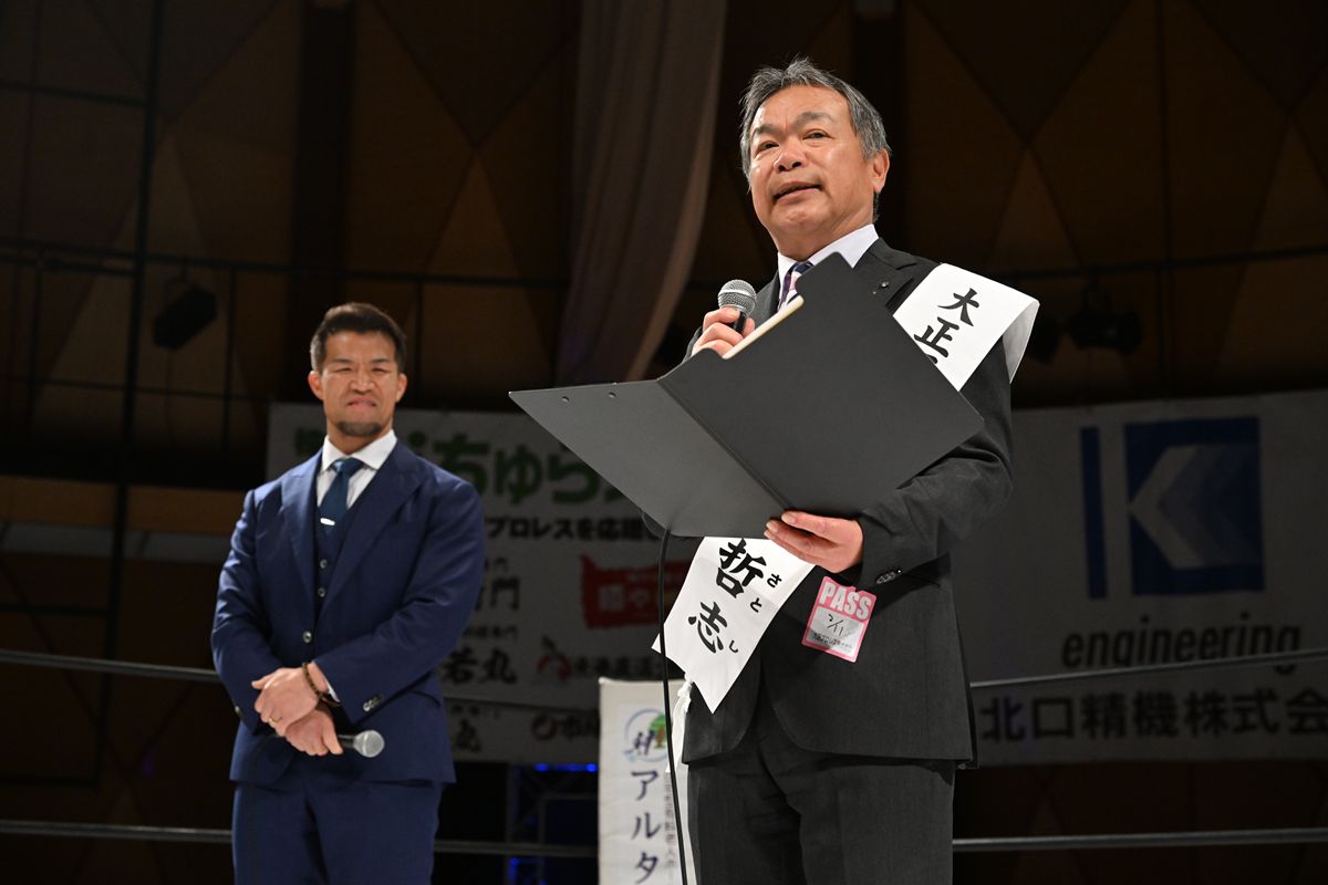 また、大会オープニングではゼウス社長と村田哲志・大正区長がリングに登壇し、地域活性化に向けた強力タッグ結成を報告した。