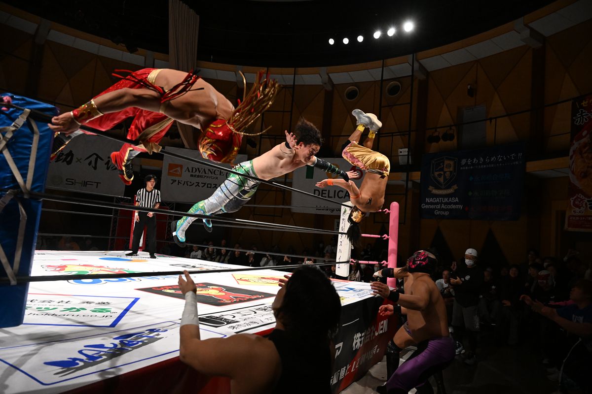 ツバサ&三原一晃組対ビリーケン・キッド&ザ・ボディガー組の一戦は、ルチャの達人であるツバサとビリーが熟練の技の応酬を見せれば、三原とボディガーはド迫力の肉弾チョップとタックル合戦で会場を揺らす。