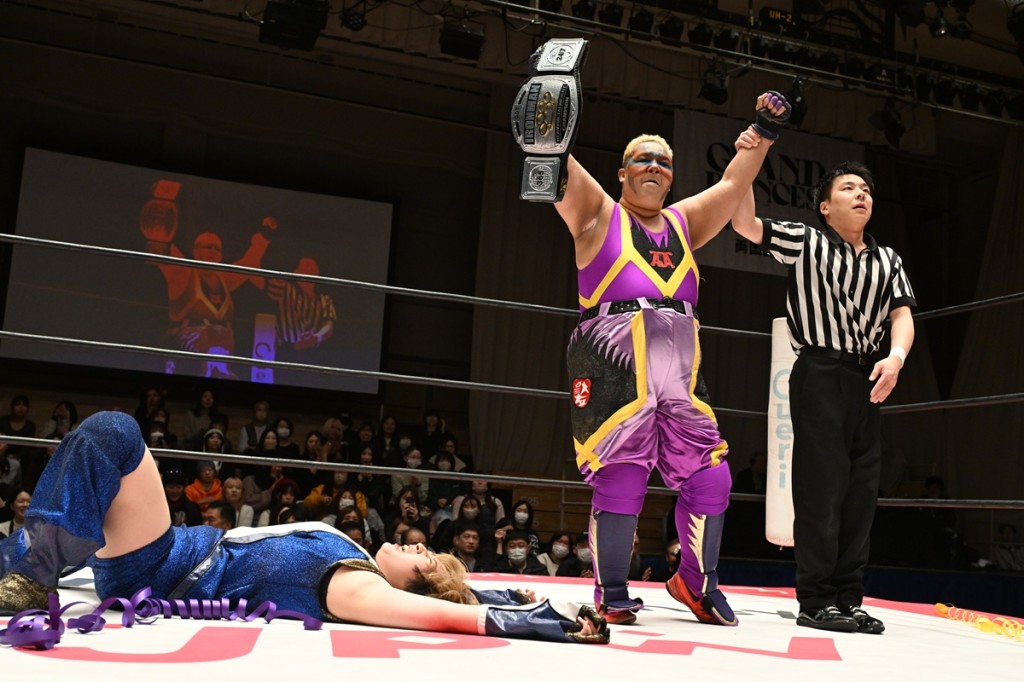 ※バックドロップ。真弥が防衛に失敗、アジャが第1805代王者となる。