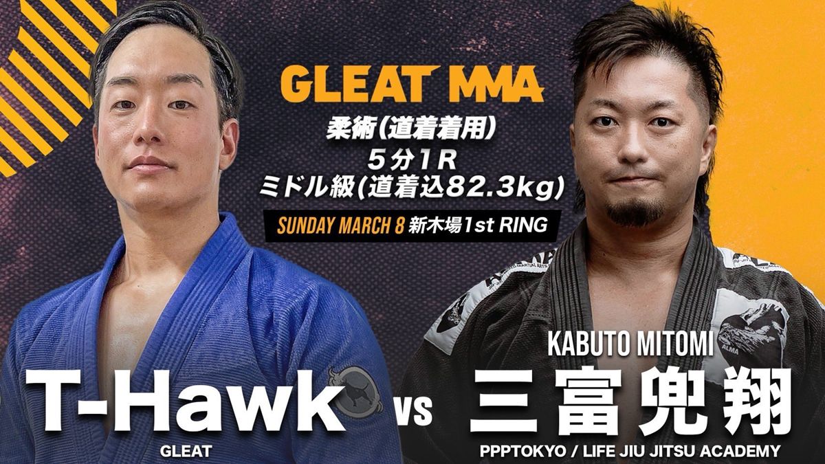 既に発表されているカードも異色作が並ぶ。「GLEAT MMA」枠では、T-Hawkが三富兜翔(PPP TOKYO)と柔術(道着着用)ルールで対戦。