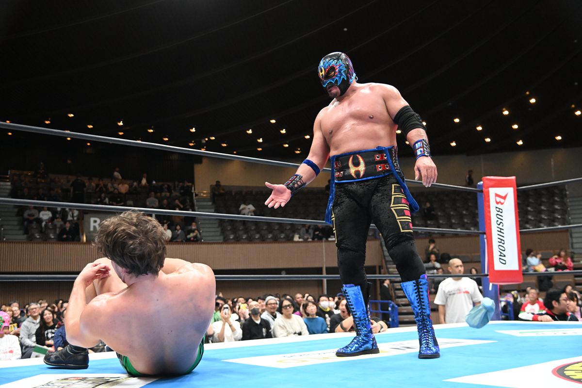 「見せつけてやったよ。そう、メキシコでCMLLでも言ったし、アメリカでも、そして今新日本プロレスでもだ。見せつけに来たぞ。なぜ私がCMLLで最高のルチャドールなのか。なぜ私がCMLLの顔なのか、なぜ私がCMLLの代表なのか。なぜメキシコとアメリカで2団体所属なのか」