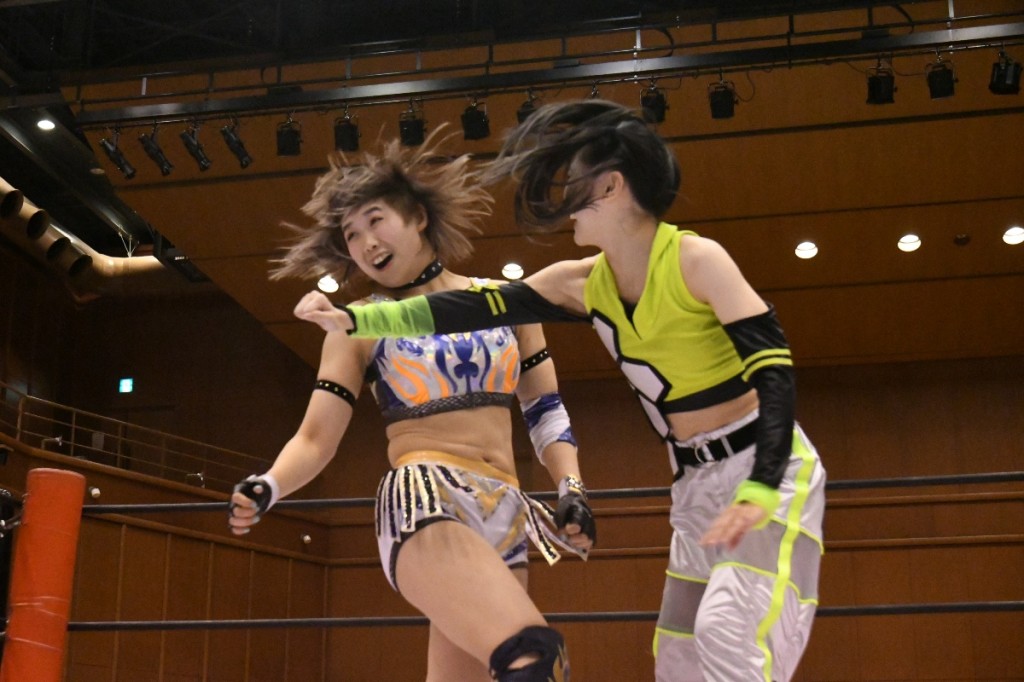 鈴芽は現在のタッグパートナー遠藤有栖とのコンビで出陣し、MIRAIは2・14後楽園での初防衛戦で、その実力を認めた凍雅と組んで激突。鈴芽にとってMIRAIは同期生であり、「BeeStar」でタッグを組んでいたとあって久々の対戦となった。