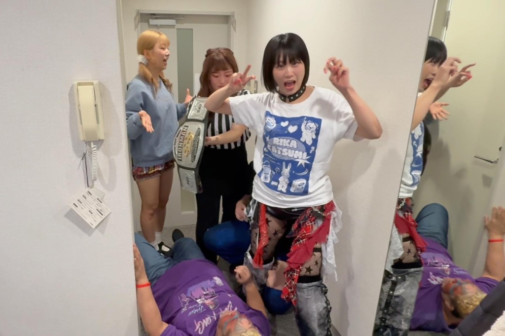 試合後、辰巳リカ、桐生真弥、原宿ぽむの3人がアジャの控え室に乗り込むと、原宿がベルト譲渡を懇願。アジャが「ベルトが欲しければ、ちゃんと勝負しろ」と主張。なぜか「有名人の名前のしりとり」で勝負することになるが、辰巳らの3人は完敗。ところが、らくが食べて、桐生が床に放り投げていたバナナの皮で、アジャは足が滑って転倒。