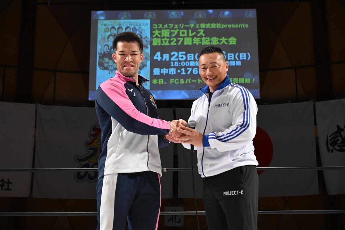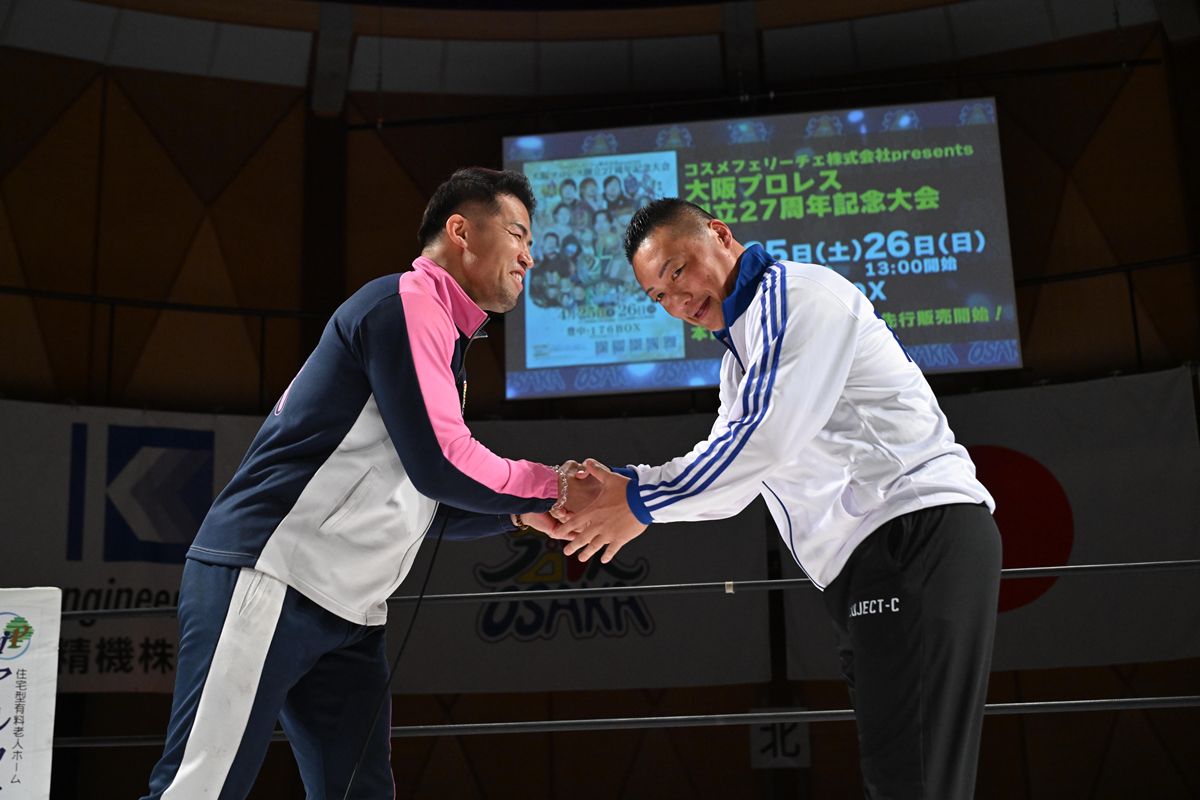 場内が大歓声に包まれる中、CIMAは大阪プロレスへの参戦と、同大会での復帰戦を行うことを力強く宣言し、ゼウス社長とガッチリ握手を交わした。