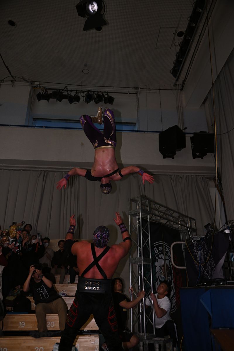 入退場ゲートの上からの決死のラ・ケブラーダで流れを引き寄せると、終盤の激しい打撃戦からカナディアンデストロイヤーで逆襲。