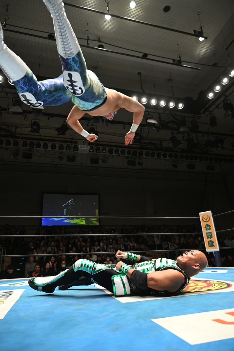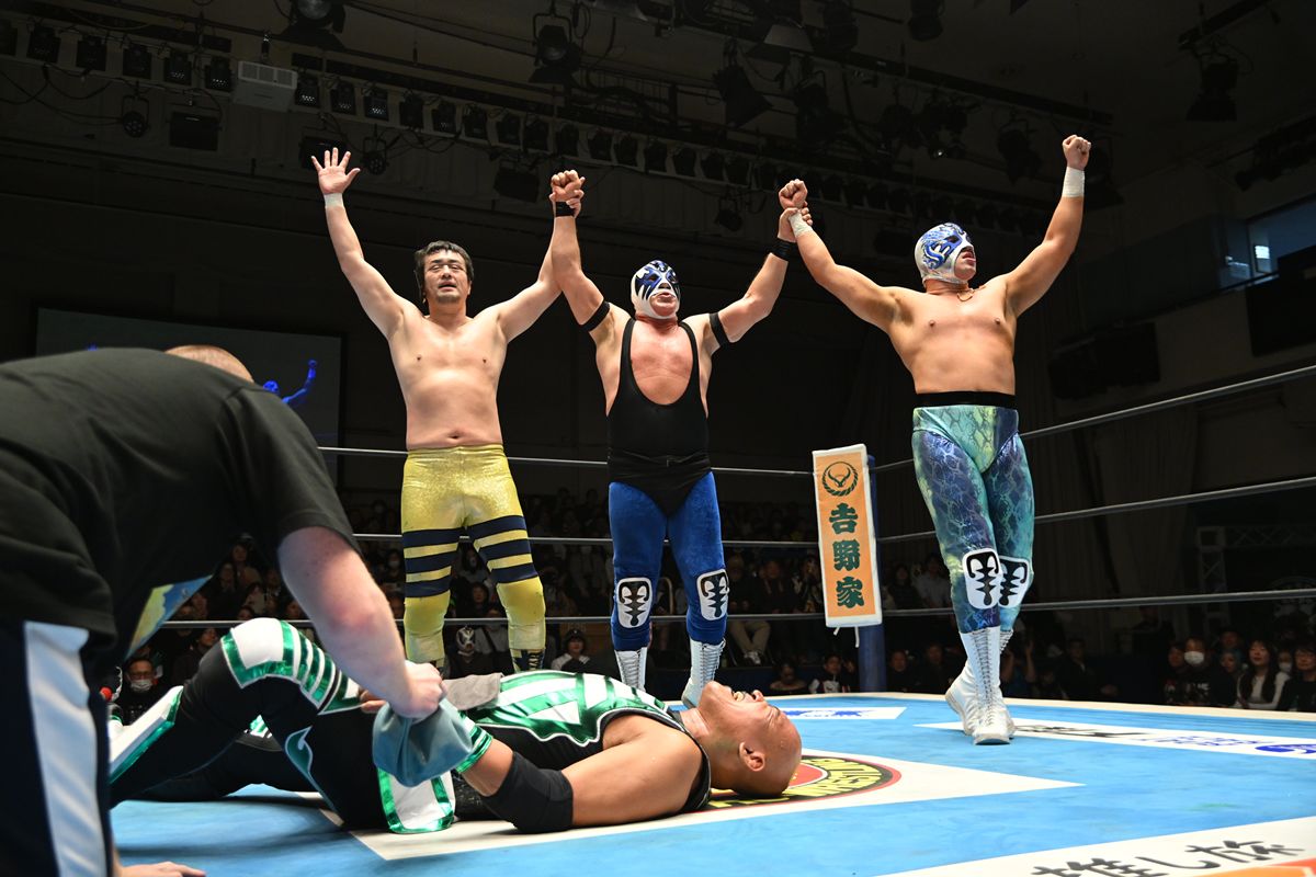 最後はアトランティス・ジュニアがOKUMURAを捉え、カウンターのパワースラムから華麗なマッドスプラッシュを投下。