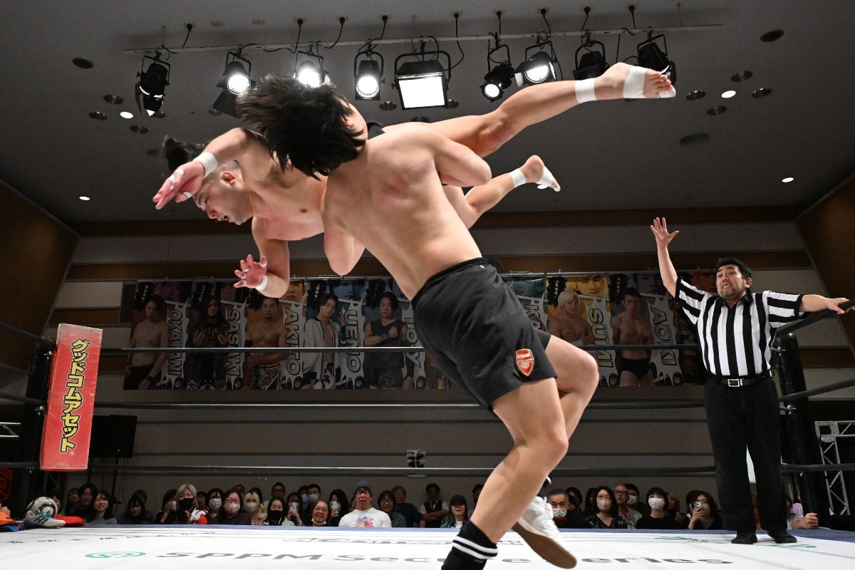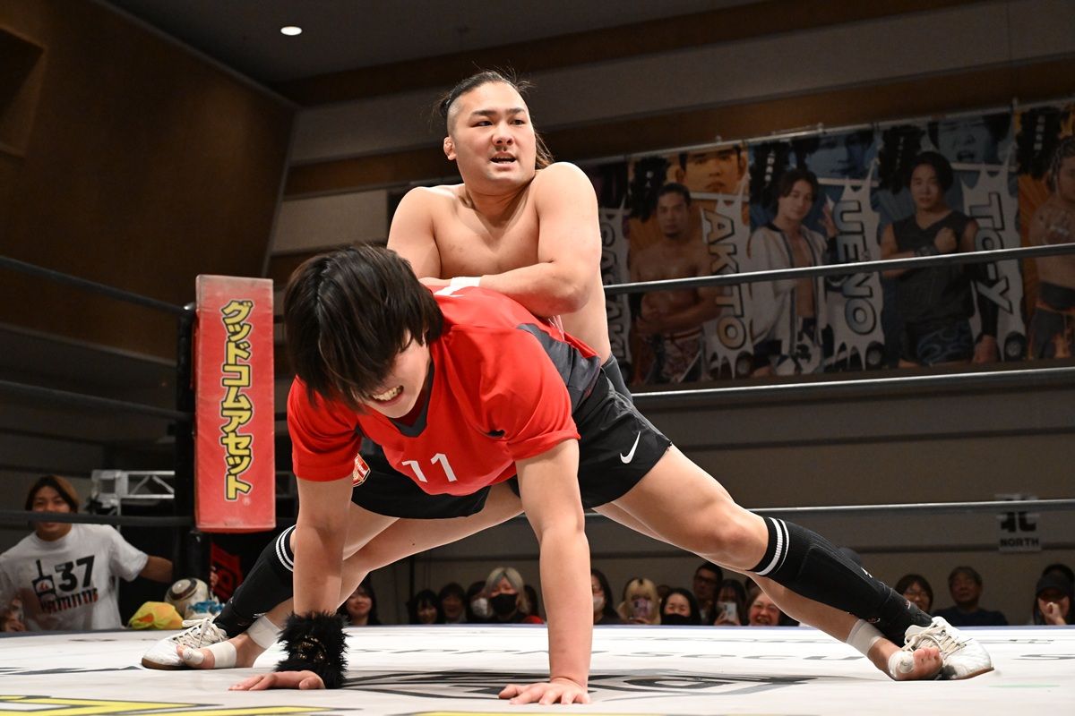 To-yはドロップキック、サッカーボールを蹴って反撃。石田は場内外で突っ張り連打、どすこいスプラッシュ。チョップのラリーとなり、To-yがスパイクを履くと、石田は塩をぶちまけて、小股すくいスープレックスもカウントは2。