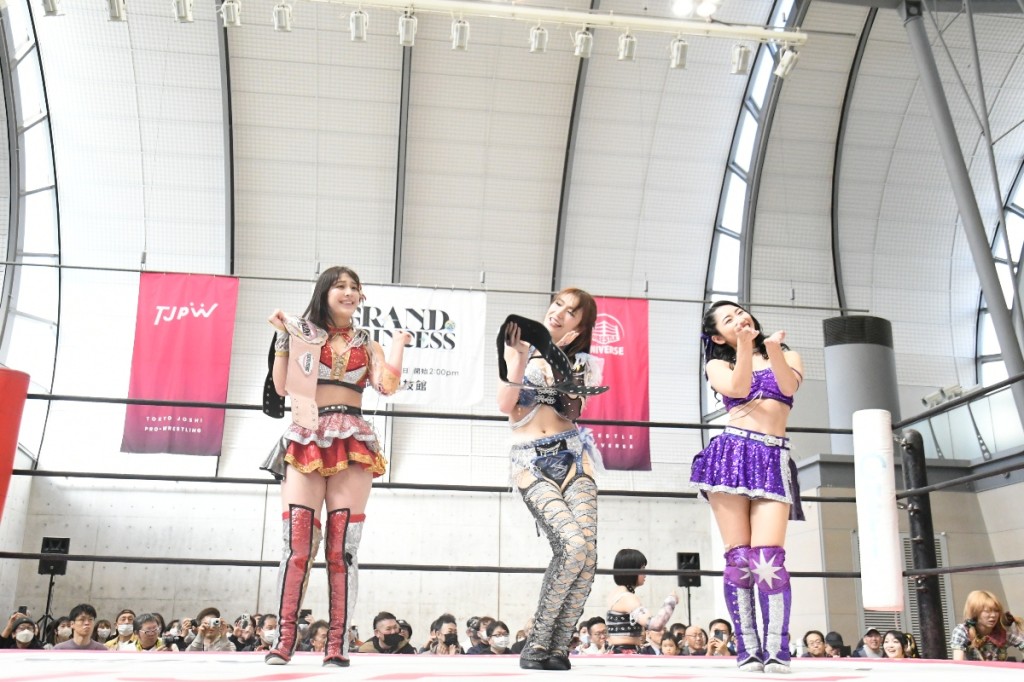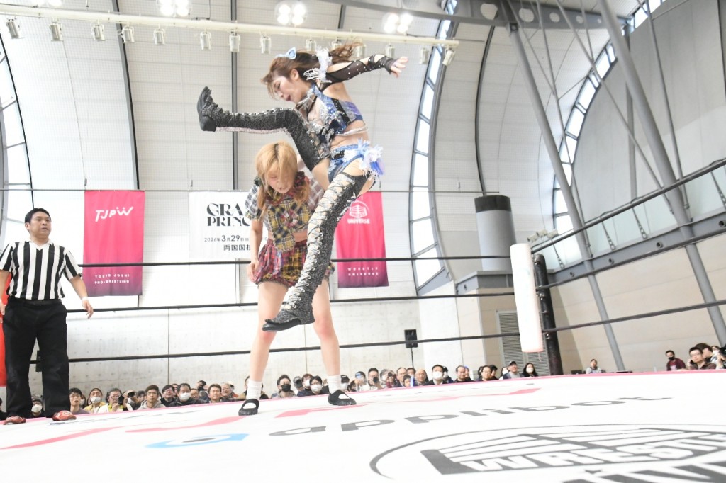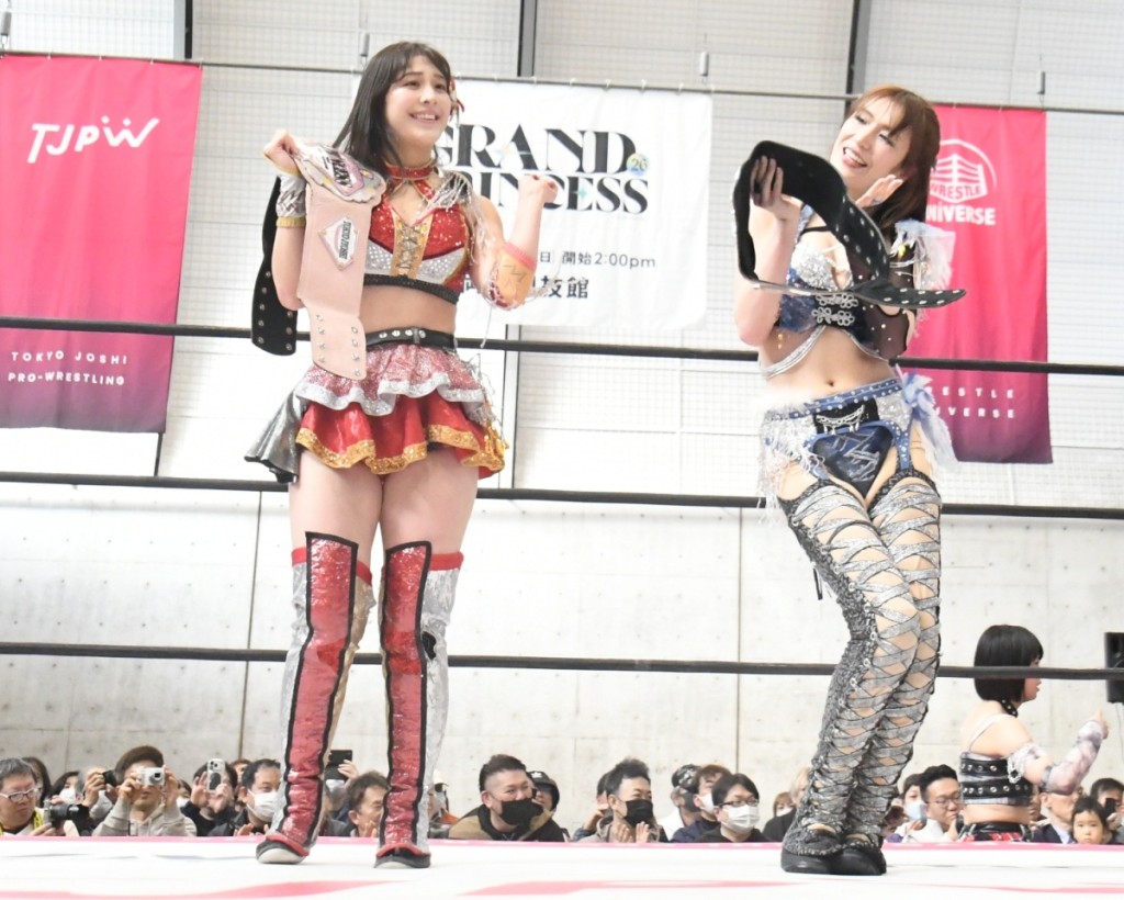 東京女子プロレスが2月28日、愛知・刈谷市の刈谷市産業振興センター(あいおいホール)で「First Sparkle at Aioi Hall」を開催した。「GRAND PRINCESS ’26」(3月29日、両国国技館)で元WWEの超大物コンビの挑戦を受けることが決まった、プリンセスタッグ王者組のOber Eats(上福ゆき&上原わかな)が日本流でコメントを出した。