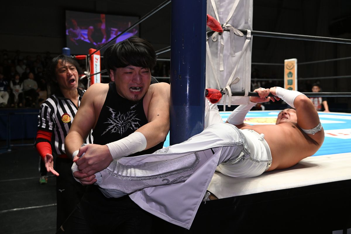一瞬の希望から絶望へと突き落とされたタイチに対し、成田蓮が改良型プッシュアップバーでの殴打から地獄の断頭台へとつなぎ、無慈悲な3カウントを奪い取った。
