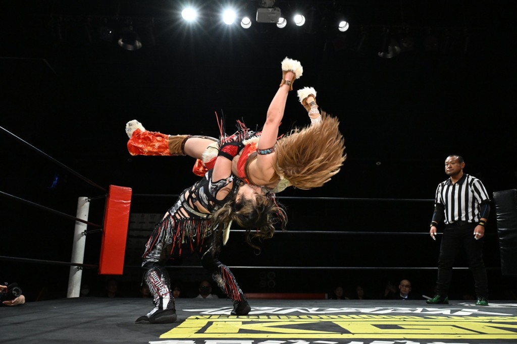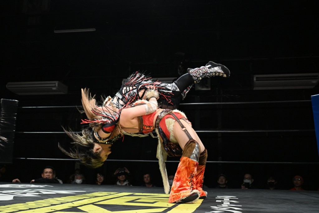 さらには飛び付いてのスリーパーもエスケープ。両者619の打ち合いから、YuuRIがジャーマンもカウントは2。バズソーキックを叩き込み、スワントーンボムで追撃も自爆。丸め込みの応酬から、YuuRIがラ・マヒストラル。一瞬の隙を突いて切り返した中島はノーザンライト・スープレックスホールドを決めて3カウントを奪った。