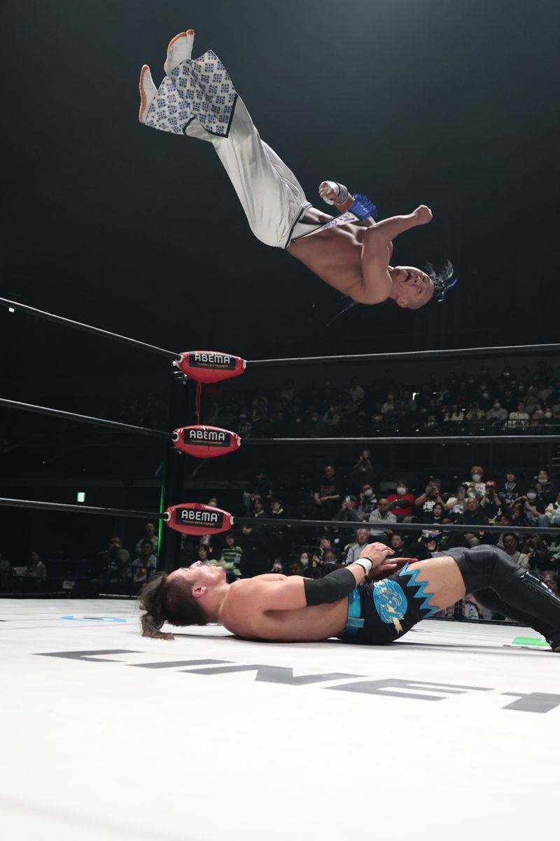海外からの刺客が見せる猛攻を凌ぎ切り、12分10秒、開国から強引にエビ固めで押さえ込んで3カウントを奪取。第60代王者として2度目の防衛に成功した。