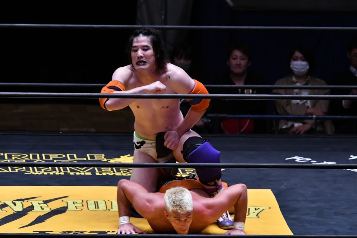 翔太:スタミナに関しては、実は意外と自信があるんですよ。というのも、今年の1月にスポルティーバアリーナで、佐々木幹矢選手と60分のアイアンマンマッチ(制限時間内で勝敗数を競うルール)をやっているんです。
