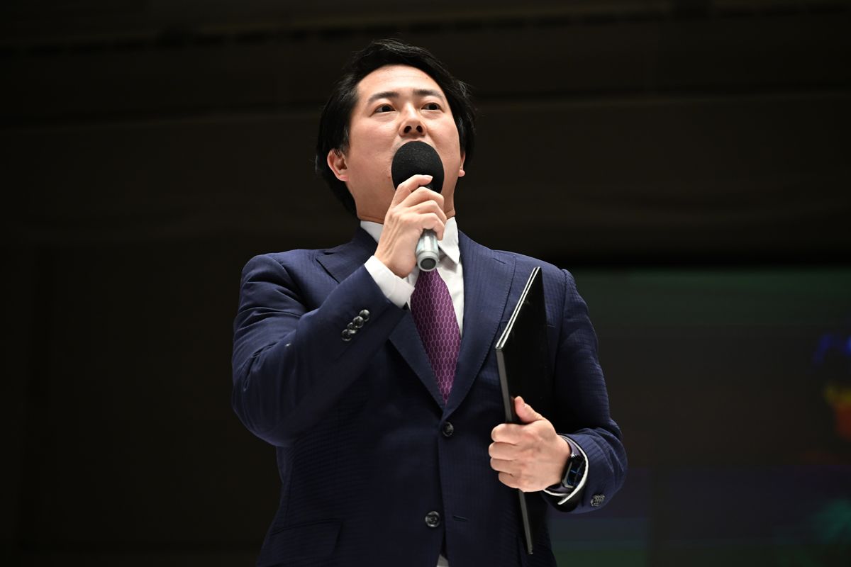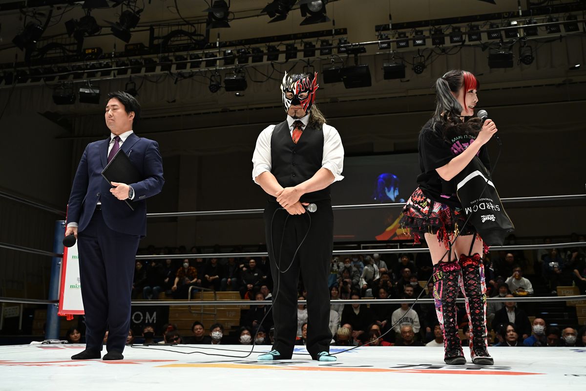 大会のオープニング、リング上に姿を見せた岡田太郎社長が「とある選手から皆さまにごあいさつがあります」とマイクを通すと、現れたのは新日本プロレスのエル・デスペラードと伊藤麻希であった。