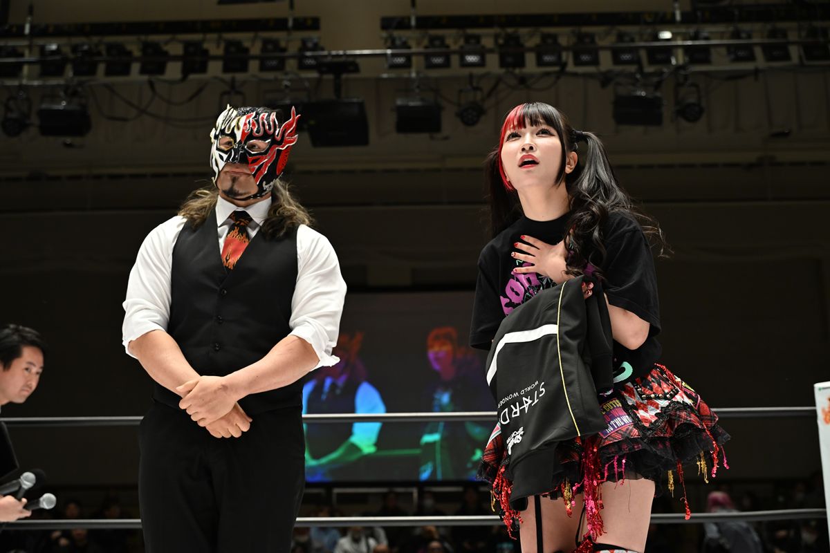 団体間の垣根を越えた大物の登場に場内がざわつく中、伊藤麻希が「大切なお知らせがあります」「この度ですね~みなさんに大切なお知らせがあります。新日本のエル・デスペラード選手がなんとスターダムに~~」と意味深長な言葉を放つ。