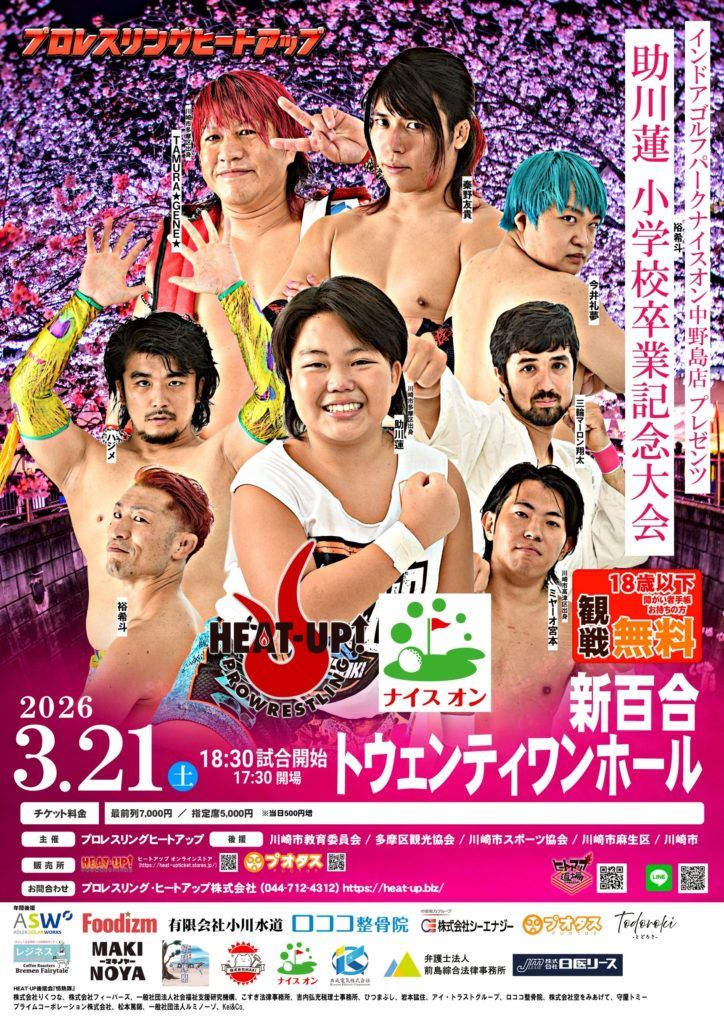 プロレスリング・ヒートアップが3月21日(土) に開催する、『インドアゴルフパーク ナイスオン中野島店 presents 助川蓮小学校卒業記念大会~大人の階段~』 (18時30分開始)に「プロレスTODAY」読者、5組10名様をご招待します。