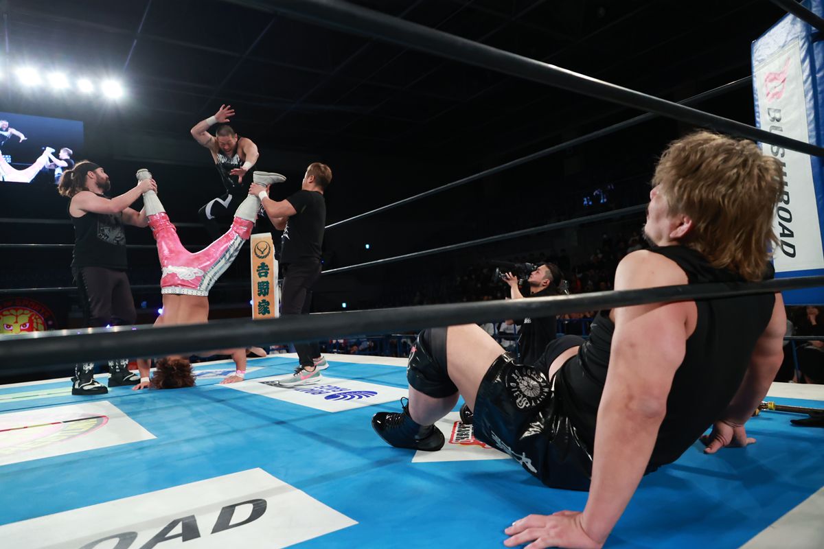 しかし、美しき真っ向勝負は最後まで続かなかった。劣勢に立たされた高橋裕二郎は、突如としてレフェリーを巻き込む反則に転じ、H.O.Tの面々をリングへ呼び込む。