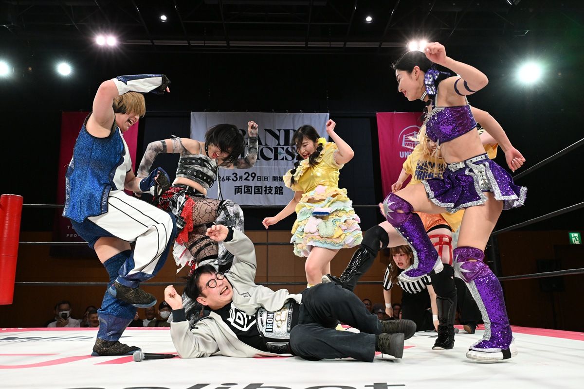 なお、第3試合の4WAYマッチ(辰巳リカvsらくvs桐生真弥vs芦田美歩)は辰巳がホワイトドラゴンスリーパーで桐生からギブアップ勝ち。試合後、この日、受付とチケットもぎり業務で来ていた現アイアンマンヘビーメタル級王者のDDT今林久弥GMをセコンドの七瀬千花が無理やりリングに上げた。桐生が「両国国技館大会で、アイアンマンのランブルがあるので返してください!」と譲渡を申し出ると、今林GMは「ダメだよ。3月22日のDDT後楽園で防衛戦決まっちゃってるから。ベルト取られたら、カード変わっちゃって会社に迷惑かかるから無理だよ」と拒否。押し問答となり、七瀬を加えた5人が今林GMにストンピング。