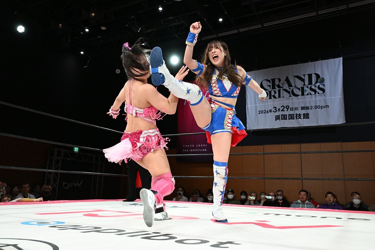 東京女子プロレスが「GRAND PRINCESS ’26」(3月29日、両国国技館)前の最後の国内大会「GRAND PRINCESS ’26 : FATE IN RYOGOKU」を同15日、東京・両国KFCホールで開催した。メインイベントでは3・29両国でプリンセス・オブ・プリンセス王座を争う、王者の渡辺未詩と挑戦者の荒井優希が熱闘ドロー。全選手が2年ぶりの大舞台に向け気合を入れた。