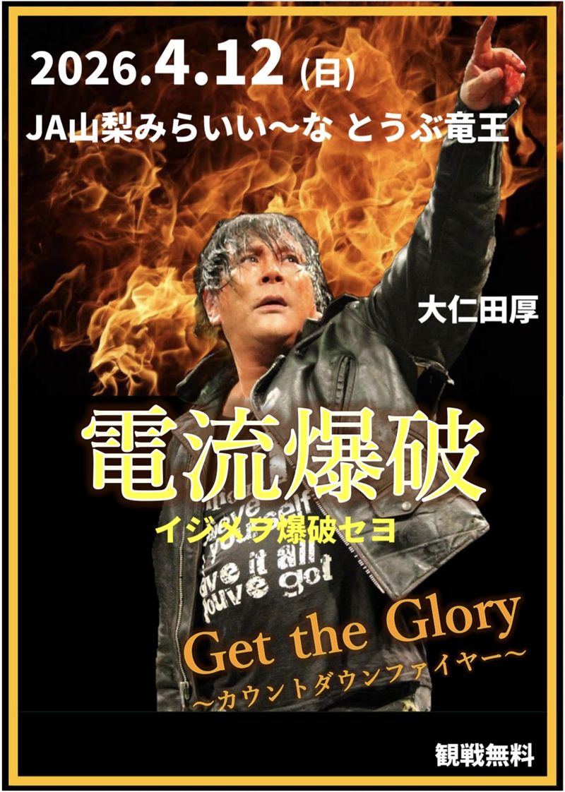 4月12日(日)、山梨県甲斐市 JA山梨みらいの、い〜なとうぶ竜王特設会場で、「Get the Gloryプロジェクト 電流爆破〜イジメを爆破セヨ〜」が開催されることが発表され、参戦する大仁田厚が大会について意気込みを語った。