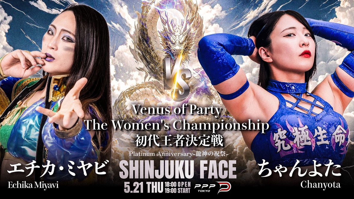 先日の3月10日新宿FACE大会で新設が発表されていた女子王座。その初代王者を決める歴史的な一戦が、5月21日の新宿FACE大会「Plutinum Anniversary-龍神の祝宴-」にて、エチカ・ミヤビとちゃんよたのシングルマッチで行われる。