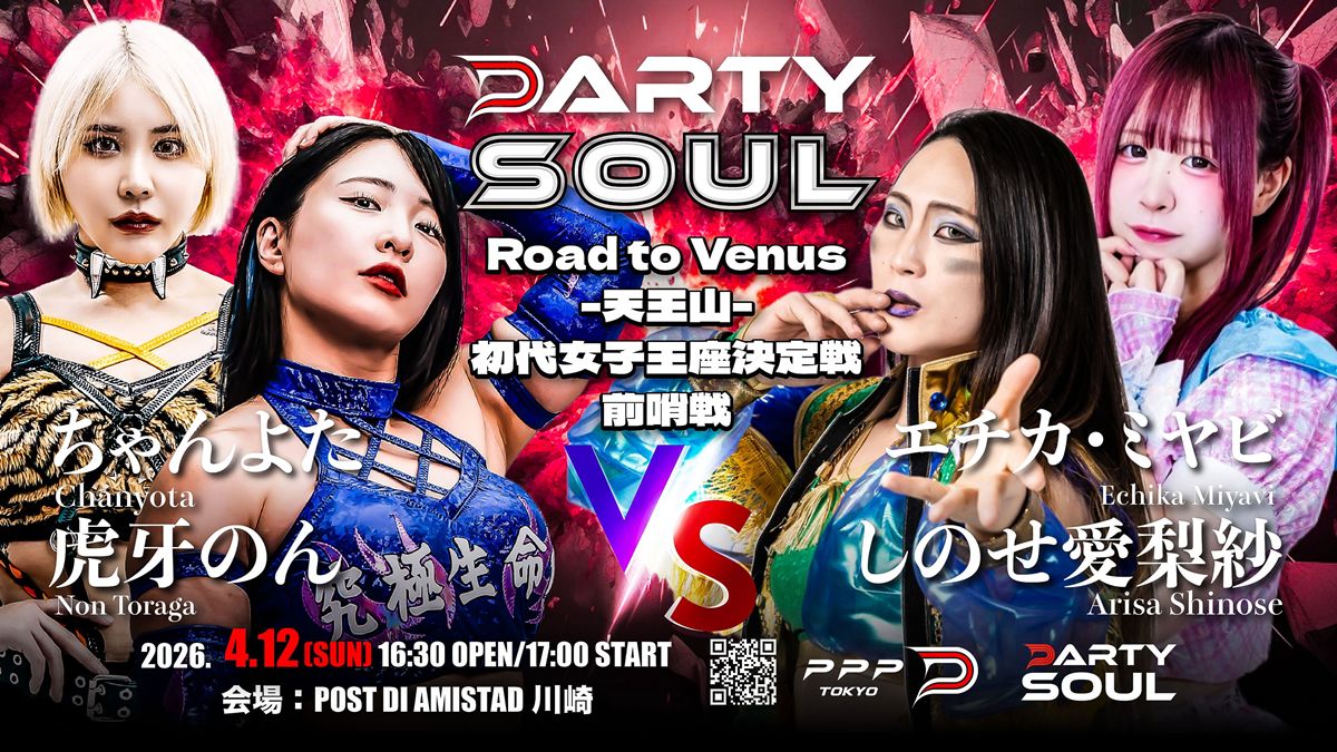 また、王座戦に向けた前哨戦とも言える4月12日の川崎公演「PartySoul vol.12」では、ちゃんよたが虎牙のんと、エチカ・ミヤビがしのせ愛梨紗とそれぞれタッグを組んで激突。