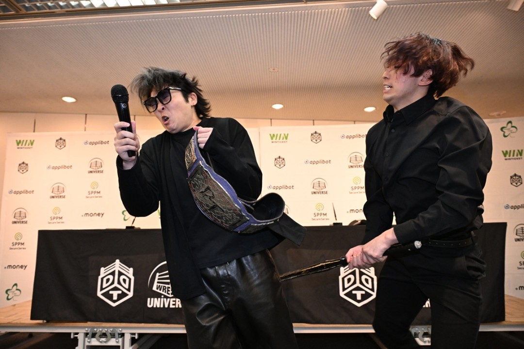 DDTプロレスが3月20日、都内で「Judgement2026~旗揚げ29周年記念大会5時間スペシャル~」(3月22日、東京・後楽園ホール)に向け公開記者会見を開いた。To-yの持つDDT EXTREME王座に挑戦する岡谷英樹が竹刀で公開制裁に処した。