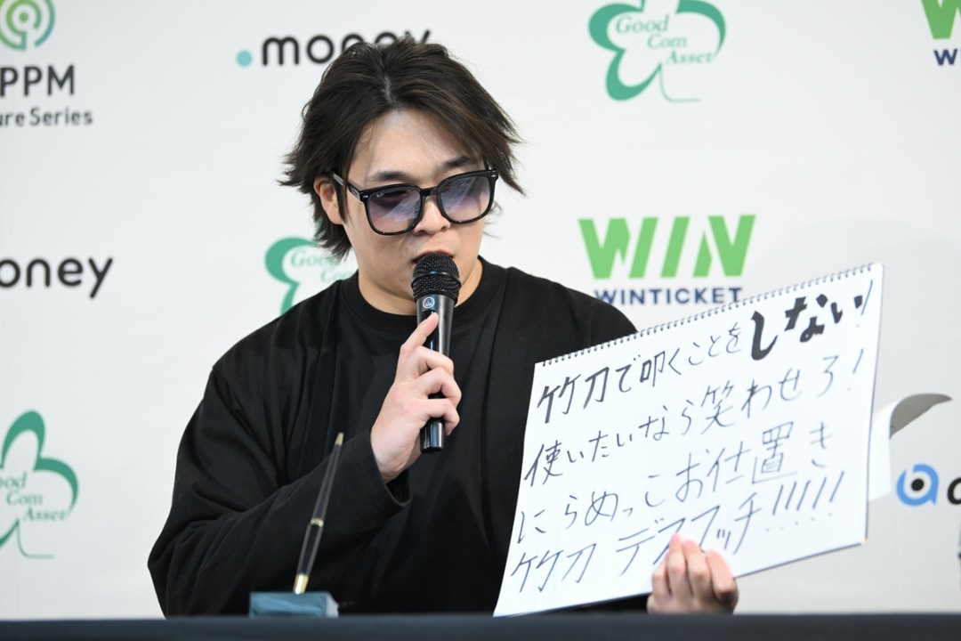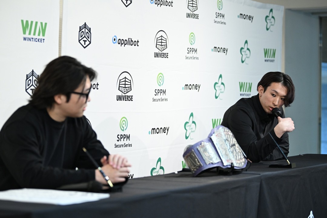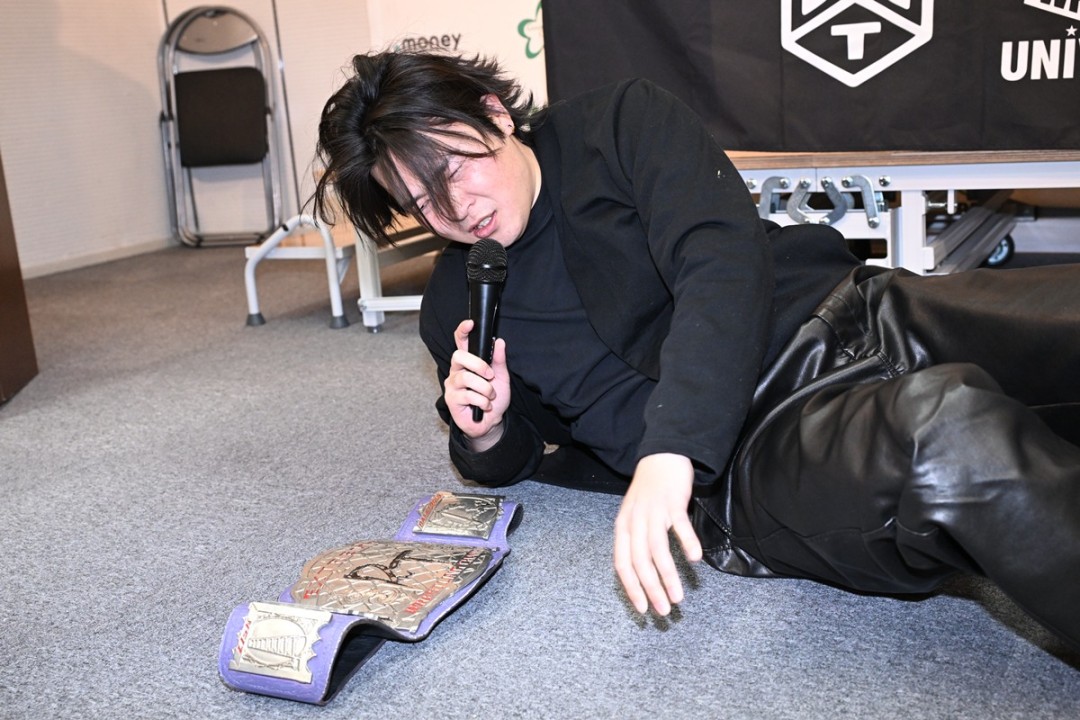 To-yは完全にダウンしていたが、今林久弥GMは情け無用でこの状況で、まさかの質疑応答に突入。「にらめっこに自信は?」と聞かれると、「ちょっとパスで」と…。「レフェリーの希望はありますか?」と問われると、「誰でもいいです」と回答。3・7名古屋でのシングルでの前哨戦では先輩・岡谷から初勝利を挙げたが「誰だって自信になるでしょう。勝ったんだから」と答えていた。
