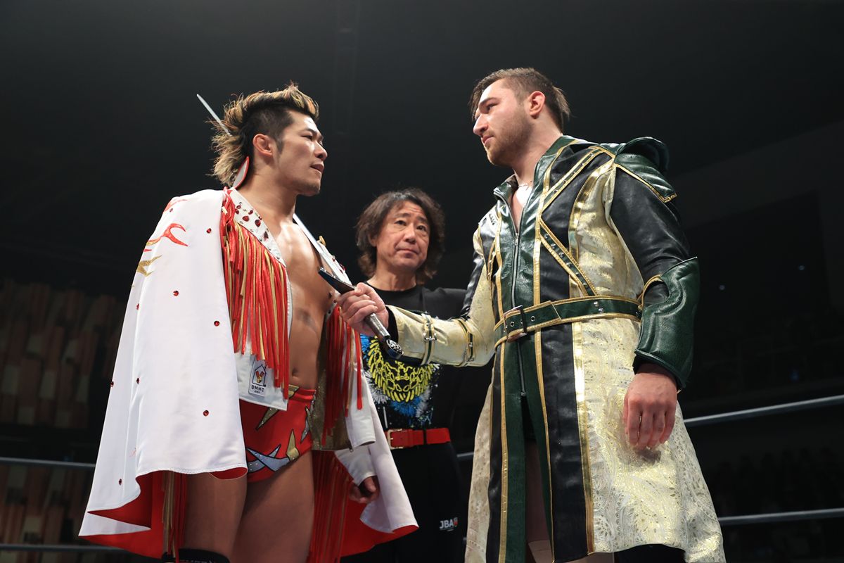 そこへ王者である辻が姿を現し、「覚悟はいいか!?」と短く宣戦布告。対するカラム・ニューマンは一歩も引かず、次期挑戦者としての絶対的な威厳を放ち、観衆へ冷酷に言い放った。