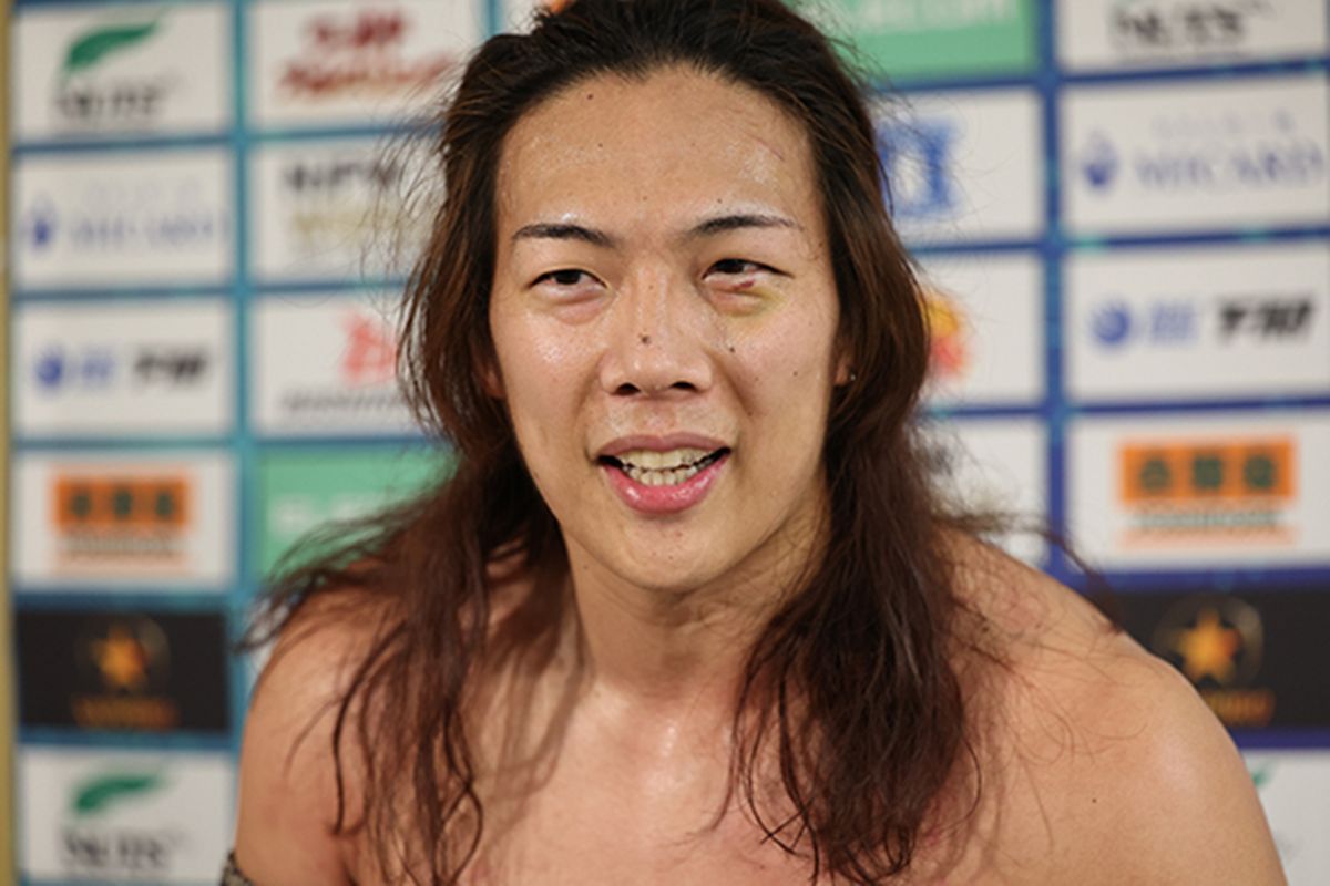 地元ファンの期待を背負ったベテランの意地を、圧倒的なパワーでねじ伏せた王者。勝ち名乗りを受けるとマイクを握り、次なる標的として因縁の相手の名を叫んだ。