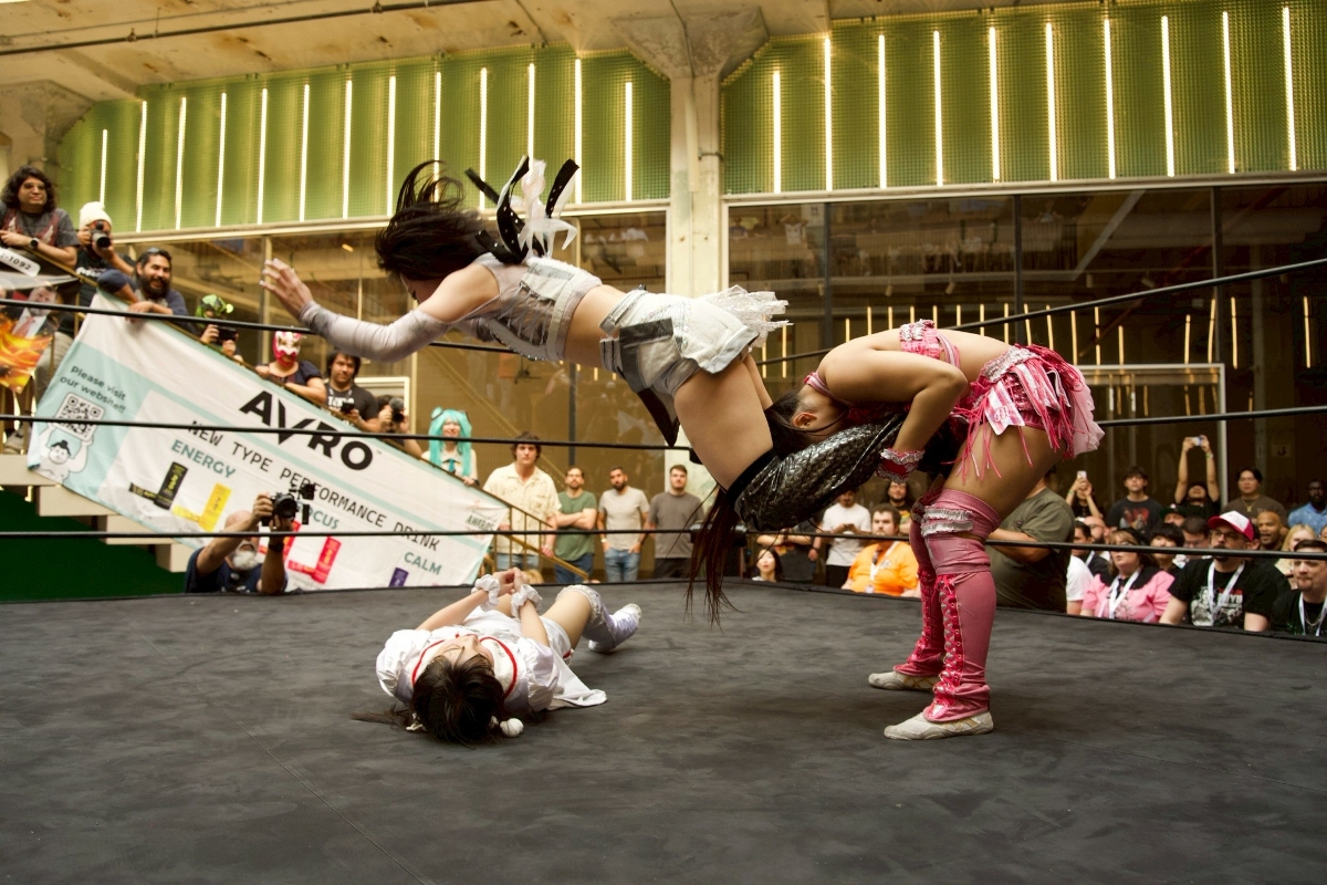 一進一退のめまぐるしい攻防が続くなか、白昼夢が高見に合体式ボディプレスを繰り出した。