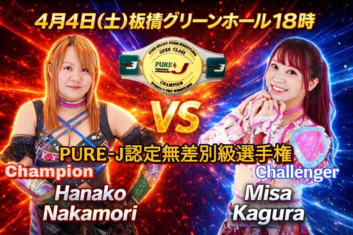 メインイベントとなる第5試合では、PURE-J認定無差別級選手権試合(30分1本勝負)が行われ、王者の中森華子に神姫楽ミサが挑戦する。