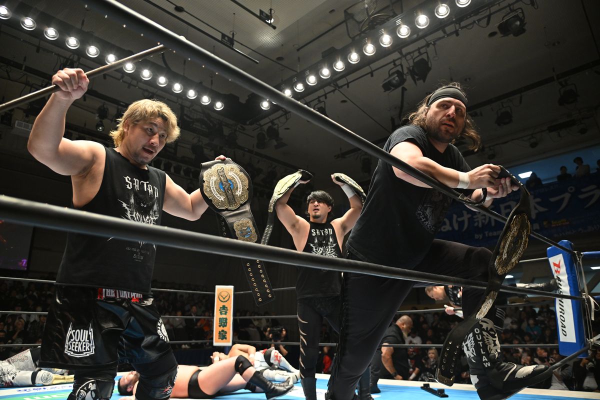 リング上に倒れ伏す王者たちをあざ笑うかのように、成田蓮、高橋裕二郎、チェーズ・オーエンズの3人は、毘沙門チンの手からNEVER無差別級6人タッグ王座のベルトを強奪。