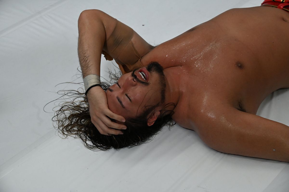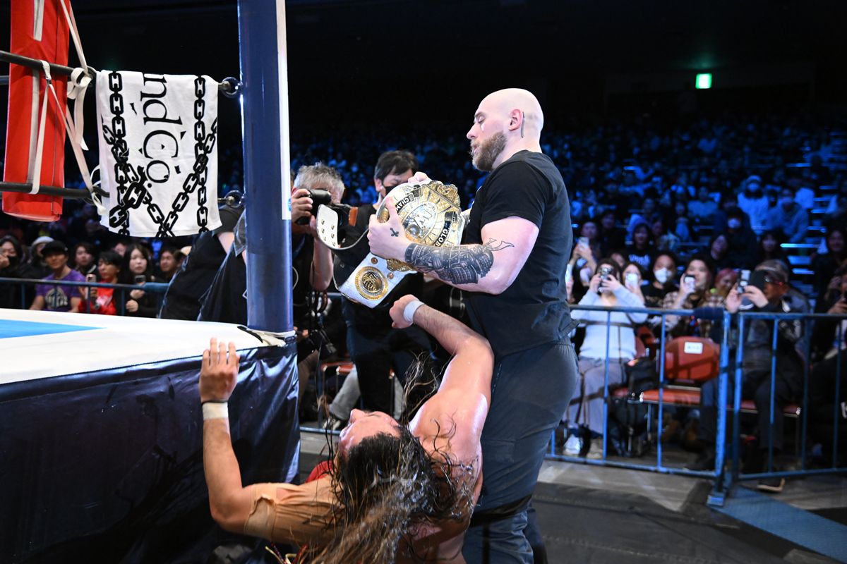 さらに、持ち込んだIWGP GLOBALベルトで辻を容赦なく殴打し、意識朦朧とする辻を引きずりながらバックステージへと姿を消した。