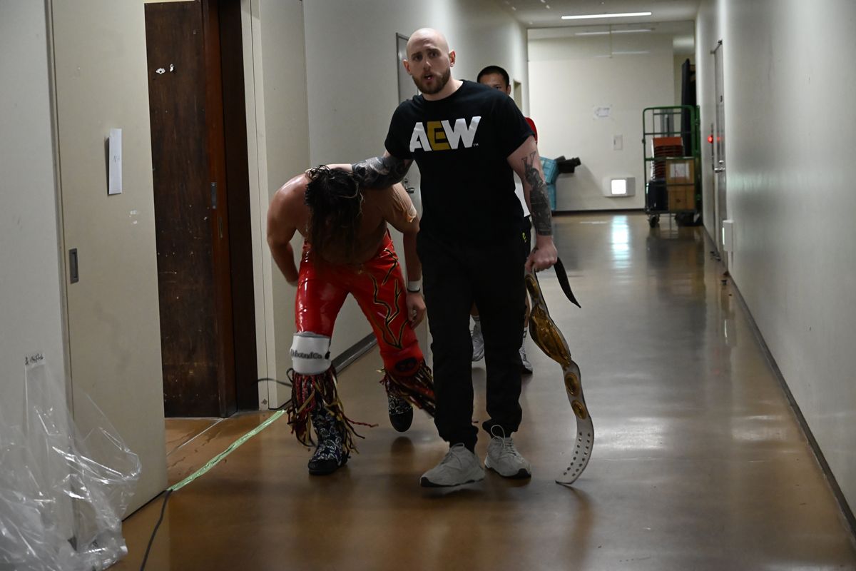 ゲイブ「(※ヤングライオンの中原に自身のスマートフォンを渡し、動画を撮影するように脅迫。辻に暴行を働きながらコメントスペースにやって来て)オイ、お前遊んでるのか?(※取材陣に対して)お前ら、カメラを俺に向けるんだ。カメラをこっちに向けろ。どこだ?ロゴはどこだ?あのロゴはどこだ?アァ、生き返ったようだ。また、生きてる感じがする。この身体に……闘志が戻ってきた。言ってること、わかるだろ?(※コメントスペースのバックパネルのライオンマークを指差し、日本語で)イチバンネ……イチバン、ジャナイ。(※英語に戻り) AEWから来てやったぞ。話そうじゃないか。俺の決断について人があれこれ言ってる。ああ?俺の決断について口出しする連中……『愛より金を選んだ』って? 違う、俺は愛を選んだ。なぜなら、この世界に対する俺の愛は、去年、完全に死んだからだ。そんな俺にもまた愛が生まれた。いつものように、そして今ここにいる。(※日本語で)ハジメマシテ。オレハ、AEWノ、ゲイブ・キッド。(※英語に戻り)俺はこのクソみたいな会社に、タナハシ、スガバヤシに……会社にいる全てのヤツらに、戦争を仕掛ける。皆、クソ食らえ。若いヤツらも、クソ食らえ。(※倒れている辻を指差し)コイツも、クソ食らえ。