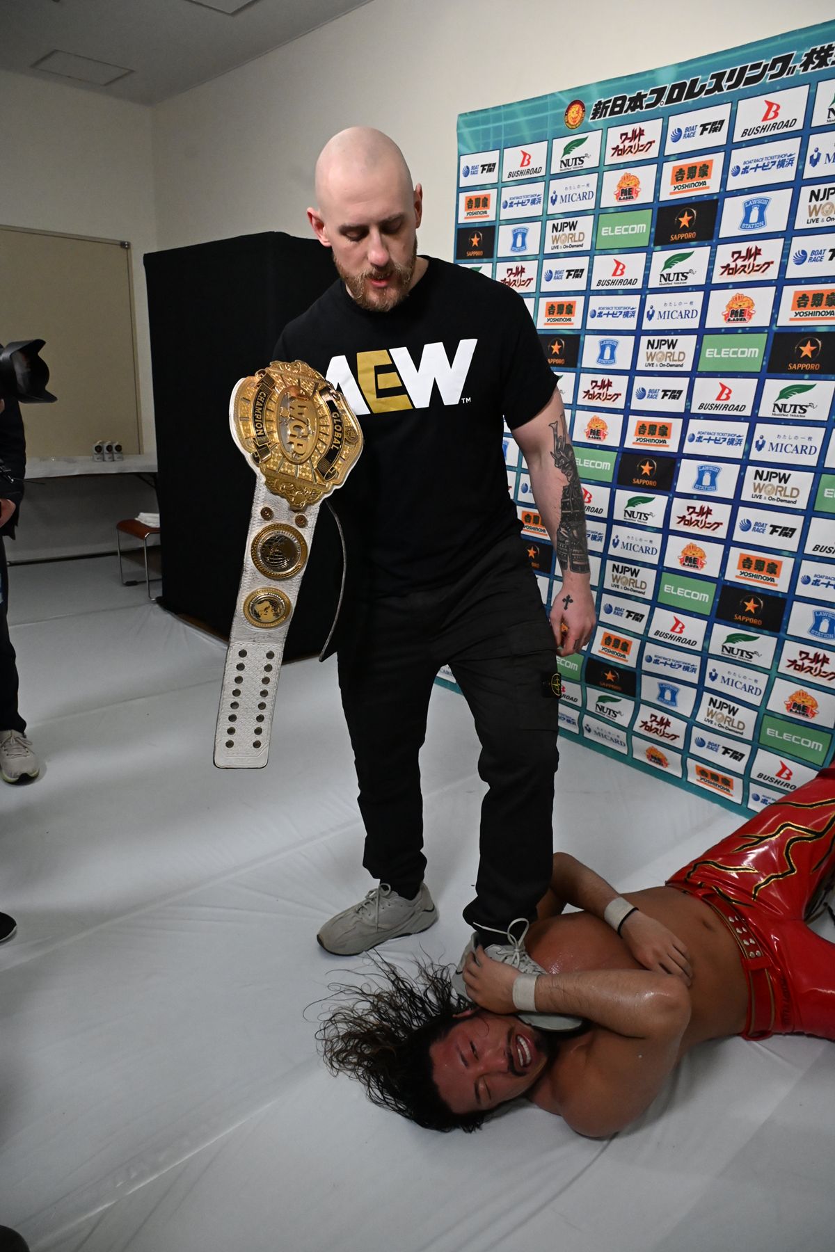 (※辻を踏みつけながら)お前がこの会社を守るつもり? “新日本”を守る? 新日本なんて茶番のようなもの。くだらない冗談だ。オスプレイがなぜ去ったのか誰も聞かない。EVILが、ヒロムがなぜ去ったのか、それも誰も触れない。それなのに、お前らは全部、俺のせいにしようとする。お前ら一人残らず、クソ食らえ……そしてクタバレ。(※辻からIWGP GLOBALヘビー級のベルトを奪い)そしてこれは俺が奪い返して、日本から遠ざけておく。これはGLOBAL王座だよな? アメリカに持ち帰って、俺が有名にしてやる。全てはここから始まる。そして最後は(※控え室の方を指差し)あっちにいるこの会社を守ろうとする連中、その全員を叩き潰す。最後に潰すのはお前らネズミどもだ。これは俺が獲る。そしてもう誰にも渡さない。(※撮影させていた中原に対して)オイ、俺の携帯を返せ。お前ら、パンチを受けたくなければ俺の前から失せるんだ。(※コメントスペースから去りながら)オイ、トニー・カーン、俺が最強のプロレスラーだぜ!クソッタレが!」