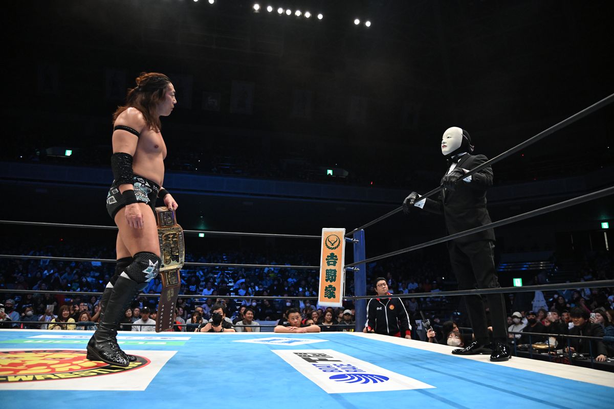 【新日本】海野翔太、あと一歩での無念のタイムアップ! 潔く敗北宣言も、TAKESHITA「新日本魂がそうさせるのか」試合後、謎の“能面男”出現&チェーズ急襲!