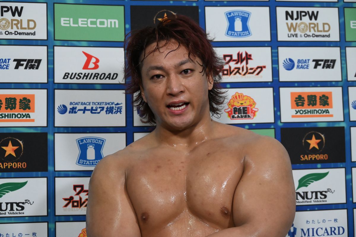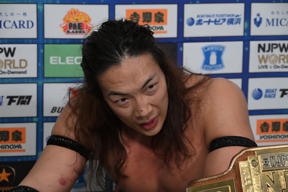 TAKESHITA「今日も勝たれへんかった。海野翔太に勝つビジョンしかないけど、この間負けて、今日は引き分けで、なんかしぶといんすよね、アイツ。なんかしぶとくて、これで立ってこないだろうっていうところから立ってくる。それが、海野翔太が持ってるものなのか、新日本魂がそうさせるのか、それは俺にはわからへんけど、なんかしぶといんよ、アイツ。そして、チェーズ・オーエンズ、そしてなんかあの“おかめ納豆”みたいな、なんかわけのわからんのが出てきたな。この俺に、世界のTAKESHITAに喧嘩売ってんのか?チェーズ、お前はこの間の長岡で裕二郎とほぼ2対1で闘って、ボコボコにしたやろう。まだ懲りてへんのか?いつでも1対1、やりたいならやったるぞ。あの“おかめ納豆”みたいなヤツも連れて来い。2人まとめてボコボコにしたるわ。海野翔太、またすぐやろうとは言えへん。俺、お前に勝てるようにもっと強くなっときますわ。From THE ALPHA」