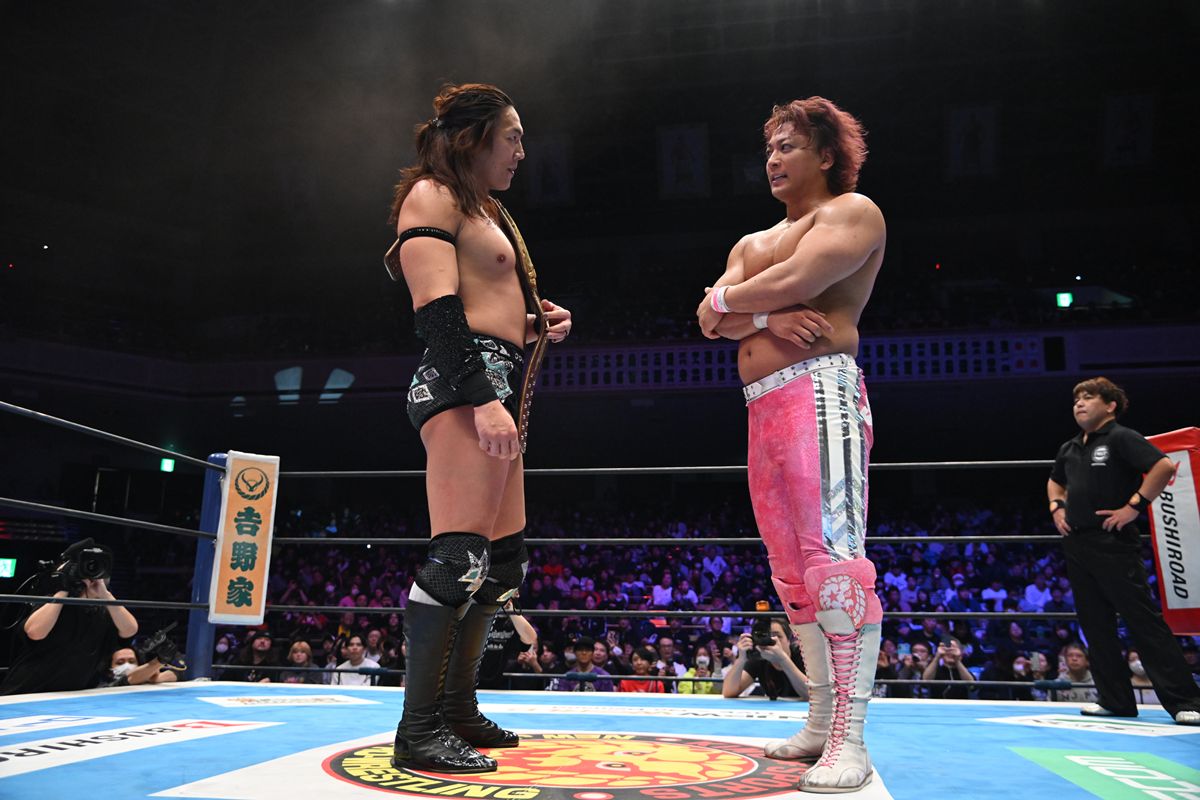TAKESHITA「今日も勝たれへんかった。海野翔太に勝つビジョンしかないけど、この間負けて、今日は引き分けで、なんかしぶといんすよね、アイツ。なんかしぶとくて、これで立ってこないだろうっていうところから立ってくる。それが、海野翔太が持ってるものなのか、新日本魂がそうさせるのか、それは俺にはわからへんけど、なんかしぶといんよ、アイツ。そして、チェーズ・オーエンズ、そしてなんかあの“おかめ納豆”みたいな、なんかわけのわからんのが出てきたな。この俺に、世界のTAKESHITAに喧嘩売ってんのか?チェーズ、お前はこの間の長岡で裕二郎とほぼ2対1で闘って、ボコボコにしたやろう。まだ懲りてへんのか?いつでも1対1、やりたいならやったるぞ。あの“おかめ納豆”みたいなヤツも連れて来い。2人まとめてボコボコにしたるわ。海野翔太、またすぐやろうとは言えへん。俺、お前に勝てるようにもっと強くなっときますわ。From THE ALPHA」